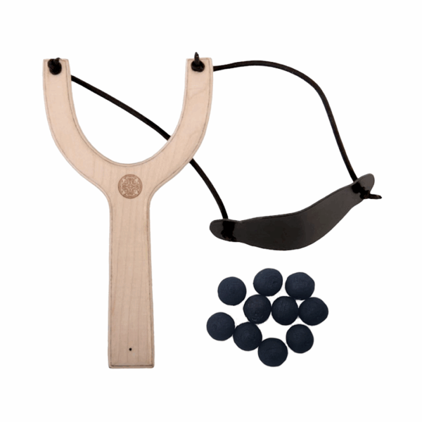 Une fronde en bois et ses 10 balles en ouate, pour des aventures médiévales en toute sécurité.